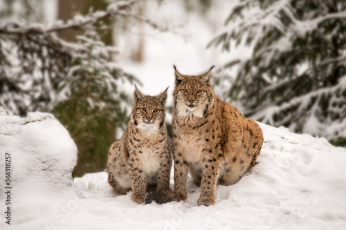 © Simon Kovacic, Obraz premium Mother and child Lynx sitting in the snow