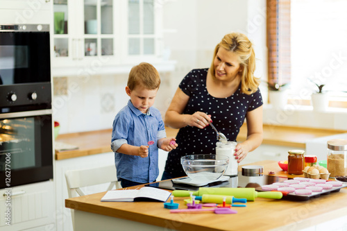 © NDABCREATIVITY, Fototapeta premium Mother and child preparing cookies