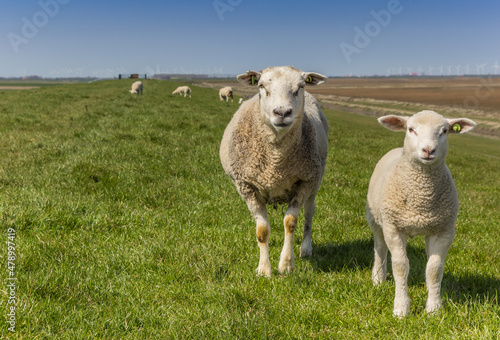 Obraz premium Mother and child sheep on a dike in Groningen, Netherlands