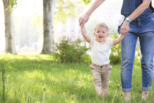 Fototapeta premium Mother and cute baby boy walking on green grass in park