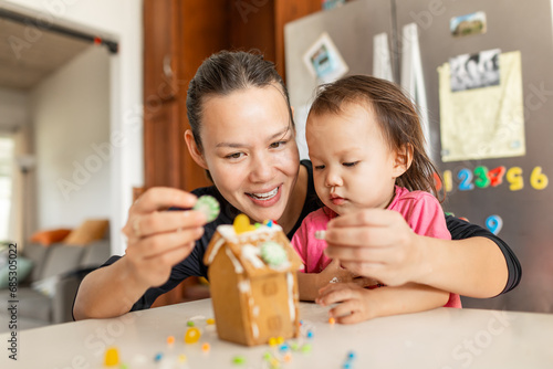 Fototapeta premium Mother and cute little girl decorating gingerbread house at home Happy family Christmas activity.