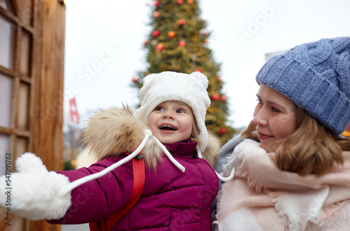 Obraz premium Mother and daughter are walking around the city on Christmas and New Year...