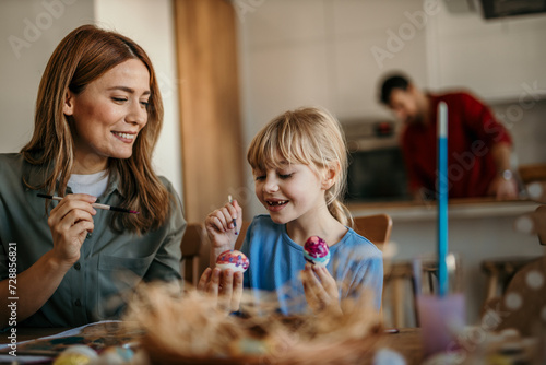 © La Famiglia, Fototapeta premium Mother and daughter bonding over Easter decorations in the dining room