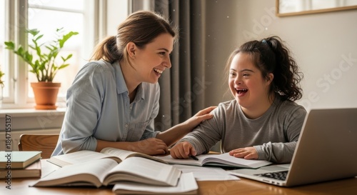 © Zahra, Fototapeta premium Mother and daughter enjoying home study session.