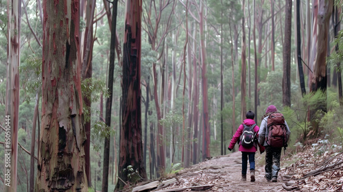 © Vitalii, Obraz premium Mother and daughter hiking in the Eucalyptus forest, Australia