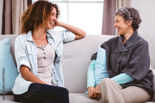 Obraz premium Mother and daughter laughing while sitting on sofa at home