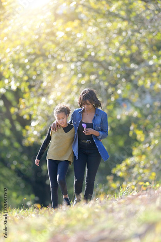 Fototapeta premium Mother and daughter picking flowers in countryside