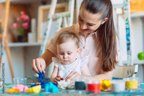 Fototapeta premium Mother and daughter playing with the kinetic sand.