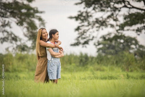 Fototapeta premium Mother and daughter standing happy in grass field