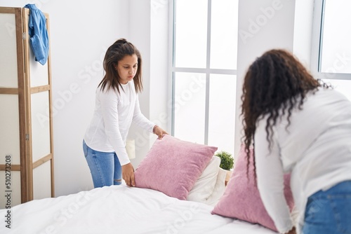 Fototapeta premium Mother and daughter standing make bed at bedroom