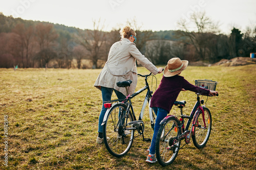 © astrosystem, Obraz premium Mother and daughter with bicycles on countryside.
