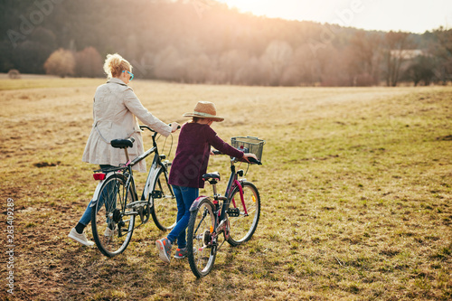 Fototapeta premium Mother and daughter with bicycles on countryside.