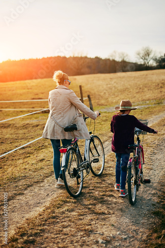 © astrosystem, Obraz premium Mother and daughter with bicycles on countryside.