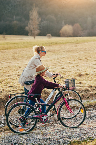 © astrosystem, Obraz premium Mother and daughter with bicycles on countryside.