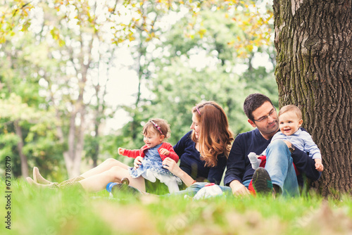 © Aleksandar, Obraz premium Mother and father with their babies outdoor