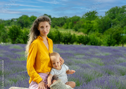 Fototapeta premium Mother and her baby in the lavender field .