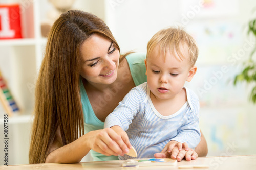 Fototapeta premium mother and her child play with colorful puzzle toy