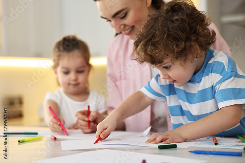 Fototapeta premium Mother and her little children drawing with colorful markers at table in kitchen, selective focus