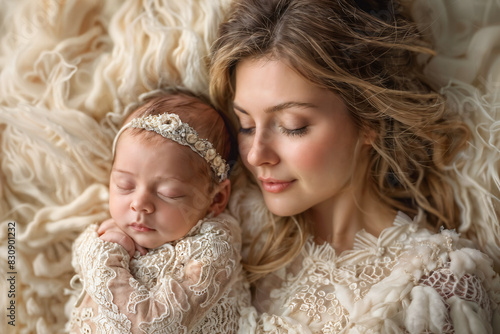 Obraz premium Mother and Newborn Daughter Sleeping Together in Matching Lace Outfits