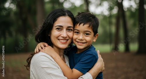 © Lumeo, Fototapeta premium Mother and son embrace outdoors