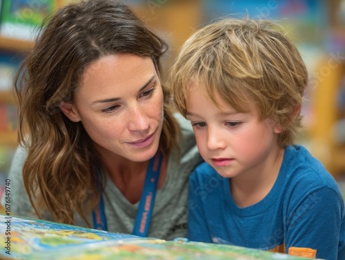 Fototapeta premium Mother and son engaging in a learning activity at bookstore or library, focused on education and development, close-up of their faces showing concentration