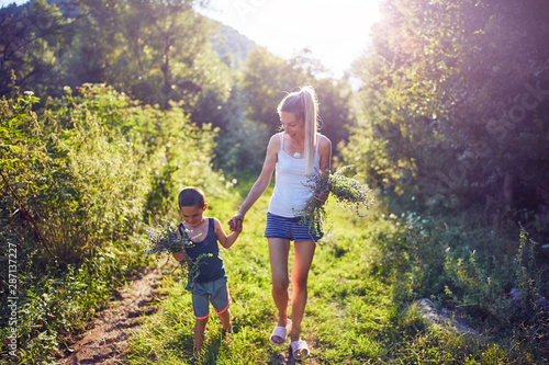 Obraz premium Mother and son picking flowers / herbs in nature.