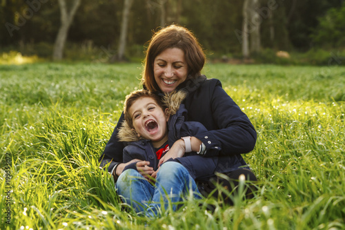 © Victor, Fototapeta premium Mother and son sitting on the field at sunset