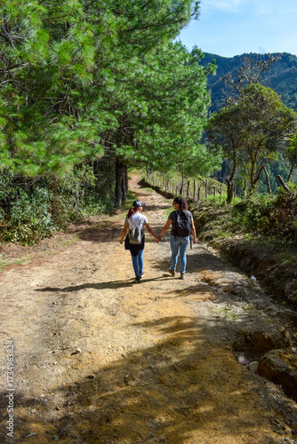 © Sergio Palacio, Fototapeta premium Mother and Teenage Daughter Holding Hands Walking Down Dirt Road or Rural Path, Exploring Nature and Family Bonding in Countryside Landscape