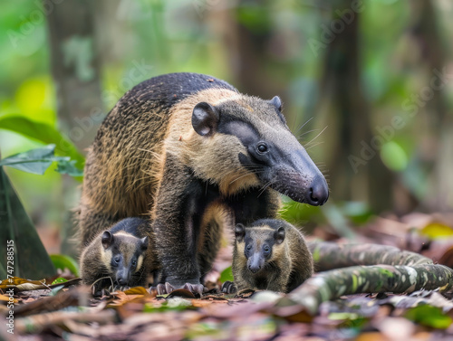Obraz premium Mother anteater with babies strolling through a lush forest.