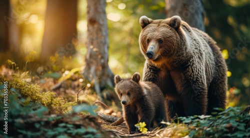 Fototapeta premium Mother bear and her cub sharing a tender moment in the forest.