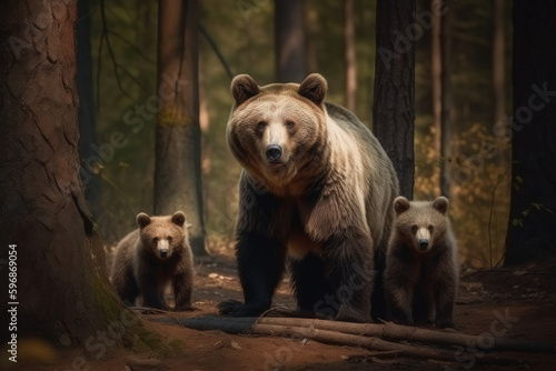 Fototapeta premium mother bear with her cubs looking at the camera, ai generated.