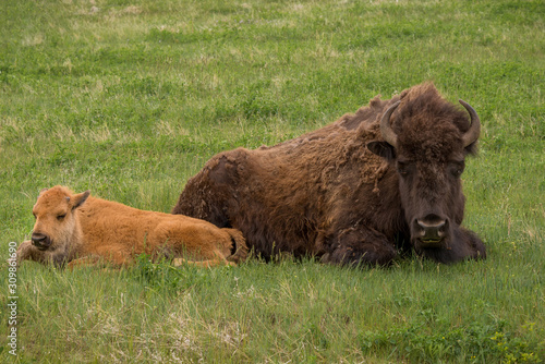 © Tammi Mild, Fototapeta premium Mother buffalo with her young in field