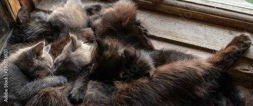 © natagolubnycha, Fototapeta premium Mother cat feeds her kittens on windowsill