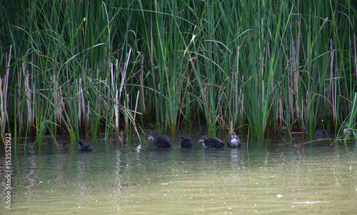 Fototapeta premium Mother coot leads her chicks through the calm, shallow waters of a reed and wetland. Surrounded by dense green reeds. Intimate wildlife moment captures the natural behavior of a bird family.