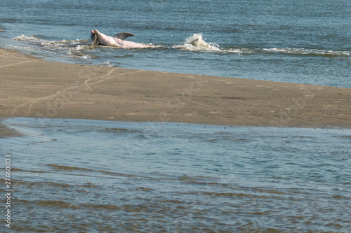 © Jeff, Fototapeta premium Mother Dolphin and Pup Strand Feeding