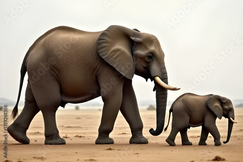 © Sergii, Fototapeta premium Mother elephant walking with her baby in the African savanna