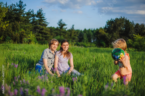 Obraz premium Mother, father and daughter play ball outside