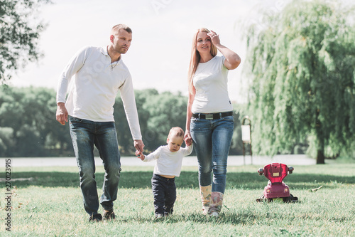Obraz premium mother, father and play with their little son for a walk in the summer Park.