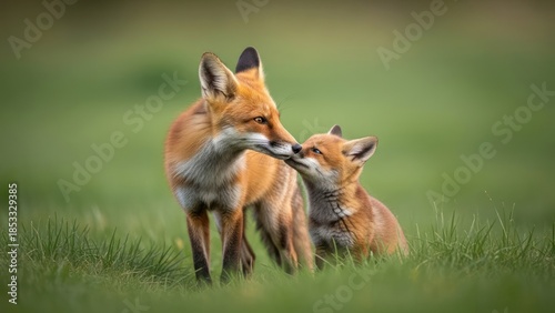 © AGUNG, Fototapeta premium Mother fox gently nuzzles a cub in a field of green grass, displaying affection