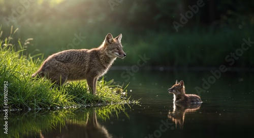 © zuperabah, Obraz premium Mother Fox Watching Cub Swimming in Calm Lake Waters