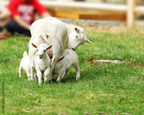 © flysnow, Obraz premium Mother goat feeding lovely white kids on farm