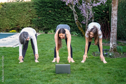 © Tetiana Soares, Obraz premium Mother, grandmother and teen daughter practicing fitness lesson online outdoors in garden at quarantine isolation period during coronavirus pandemic. Family doing sport together at home via skype
