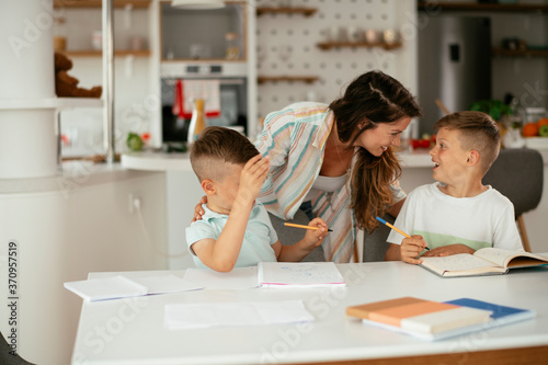 © JustLife, Obraz premium Mother helping her sons with homework at home. Little boys learning at home..