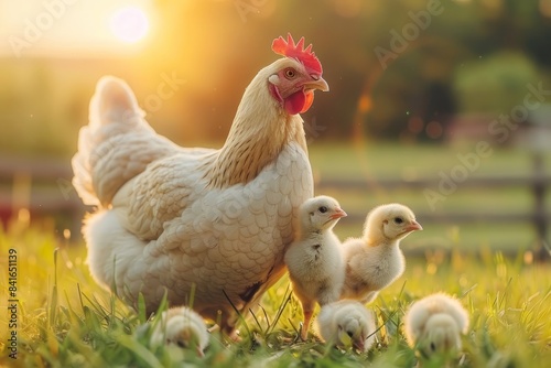 Fototapeta premium Mother hen with chicks in natural habitat, farmyard birds in beautiful outdoor setting