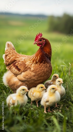 Fototapeta premium Mother Hen with Her Adorable Chicks in a Lush Green Field