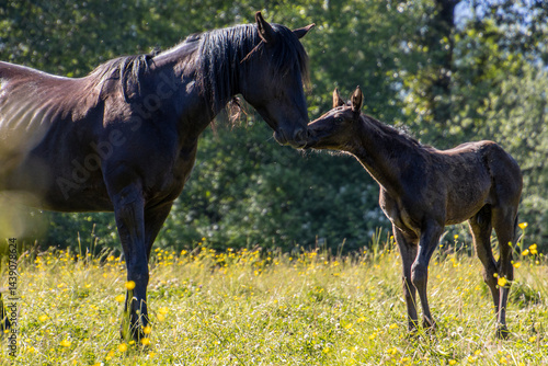 © Judit, Fototapeta premium Mother horse and foal share an affectionate moment in a sunny field surrounded by wildflowers
