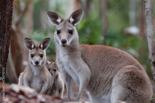 © Iftikhar alam, Fototapeta premium Mother kangaroo caring for her young joey in a lush forest setting with another playful joey nearby