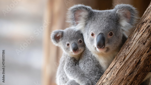 © Sergey, Obraz premium Mother koala and joey in wildlife shelter embracing safety and care