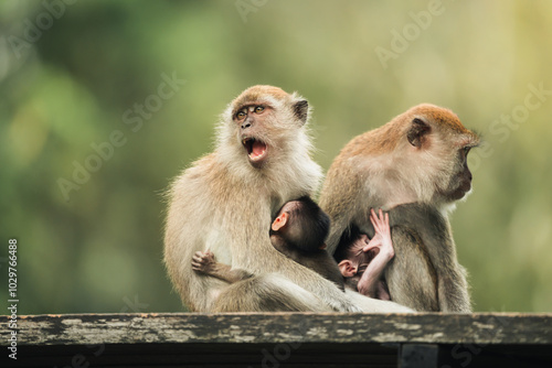 © CSJ STUDIO, Naklejka premium mother macaque monkey with infant in the park