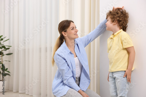 © New Africa, Fototapeta premium Mother measuring her little son’s height near white wall at home. Space for text